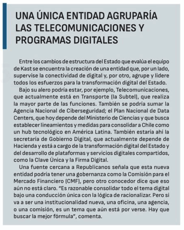 “Entre los cambios de estructura del Estado que evalúa el equipo de Kast se encuentra la creación de una entidad que, por un lado, supervise la conectividad digital y, por otro, agrupe y lidere todos los esfuerzos para la transformación digital del Estado”