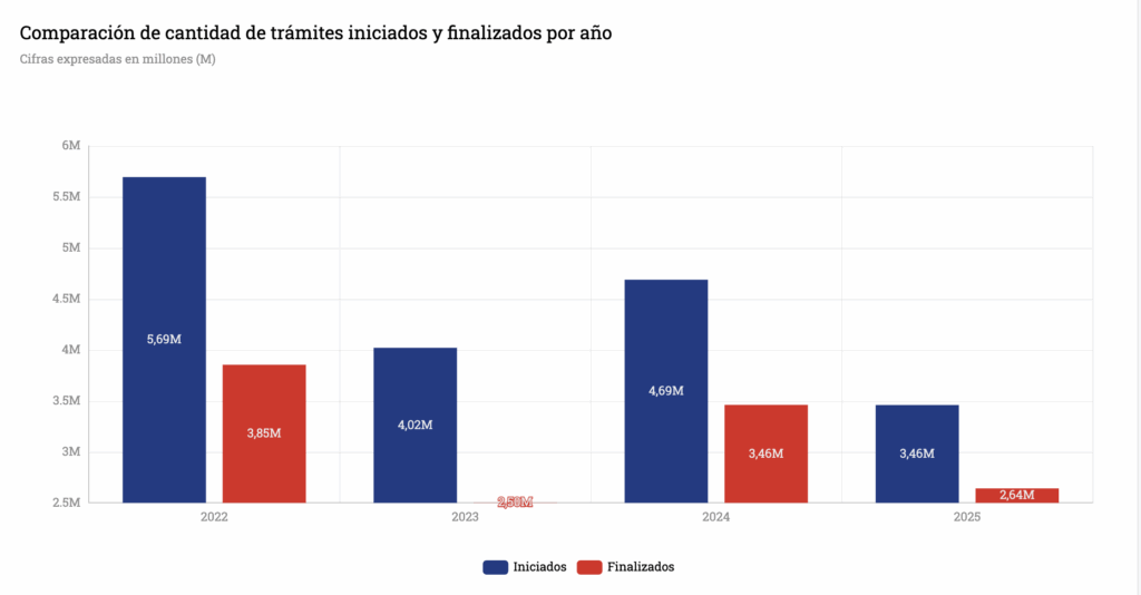 Trámites iniciados y terminados por año (Sep-2025)